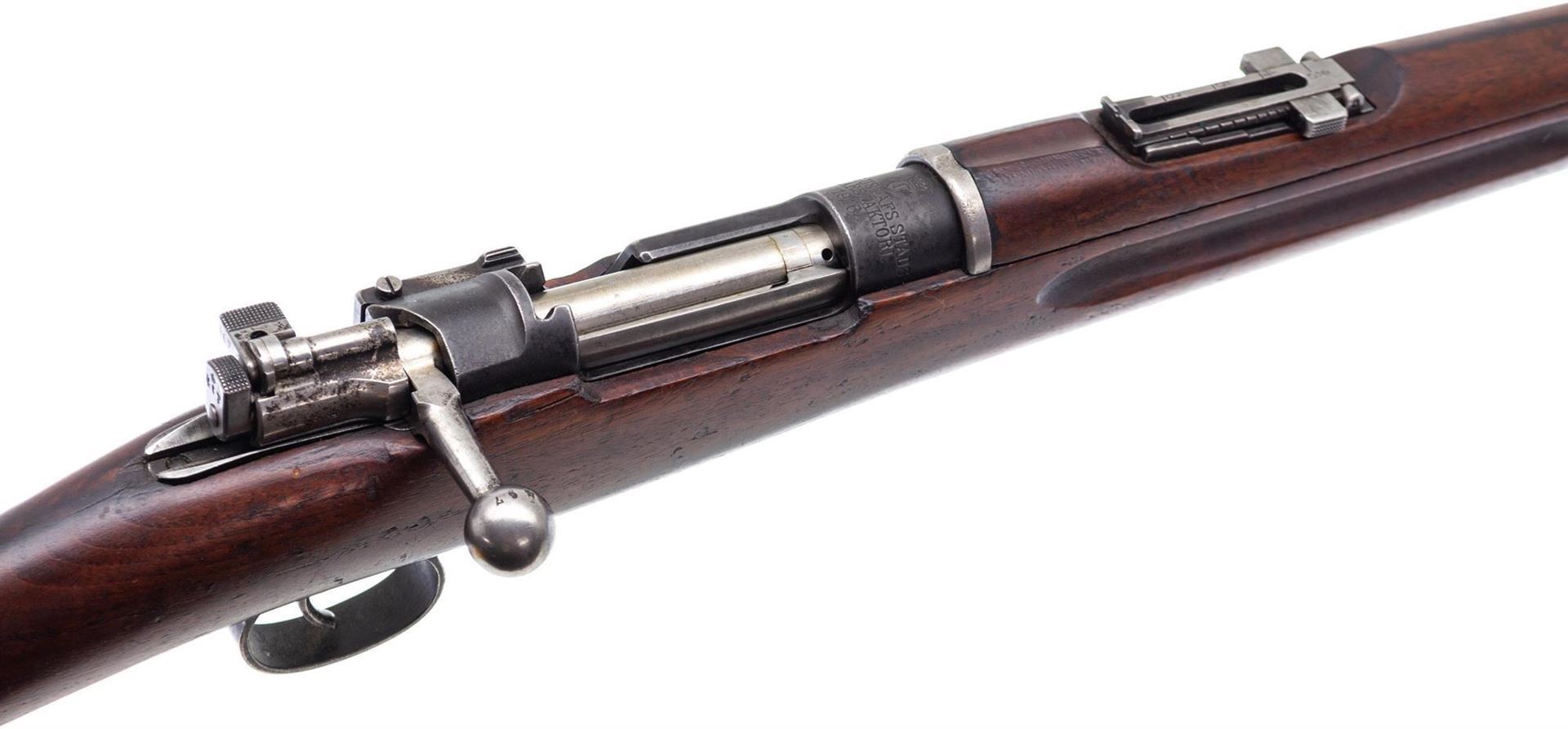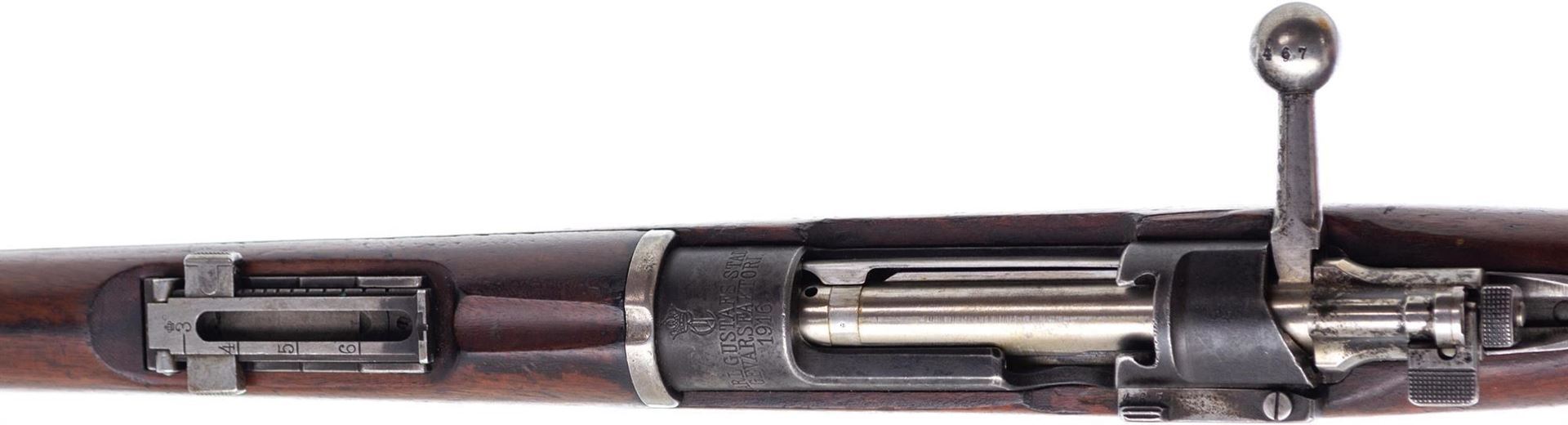 Used Carl Gustafs Mauser 96 Bolt-Action 6.5x55mm Swedish, Full Military Wood, 29" Barrel, 1916 Mfg., Threaded Muzzle, Stock Disc, Smaill Crack in Stock at Tang, Metal Finish Worn, Overall Fair Condition