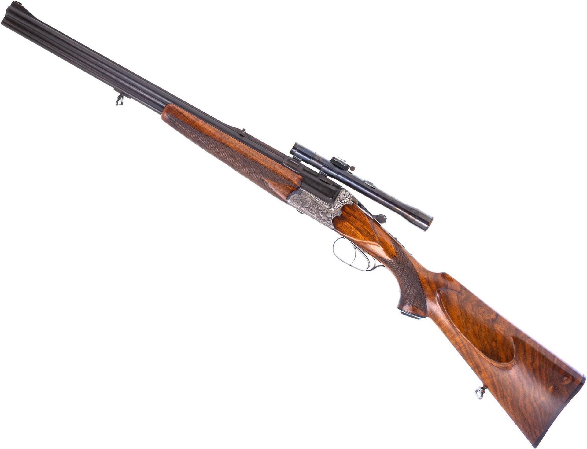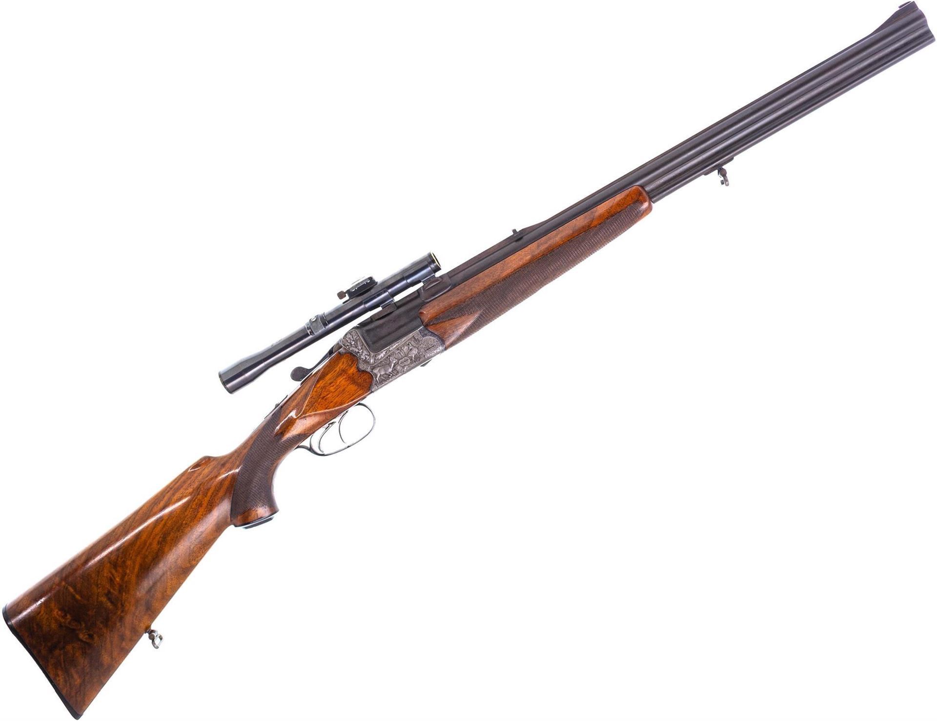 - Used Franz Sodia Over-Under Combination Gun, 6.5x57R/24Ga, 2.5", 22" Barrel, Wood Stock, Khales Mignon 2.5x Riflescope - Claw Mounts, Double Trigger, Engraved Receiver, Fixed Full Choke, Repaired Crack In Forend, Good Condition
