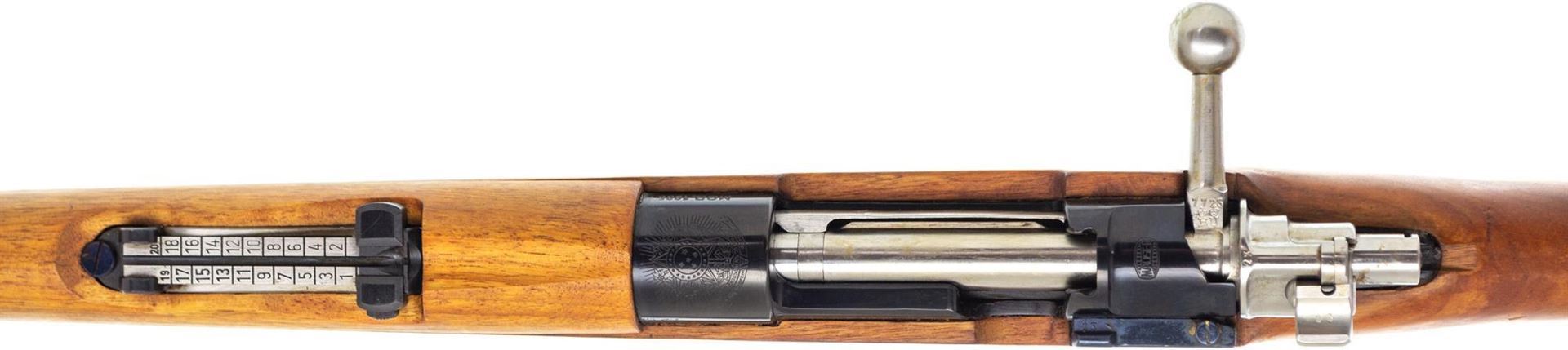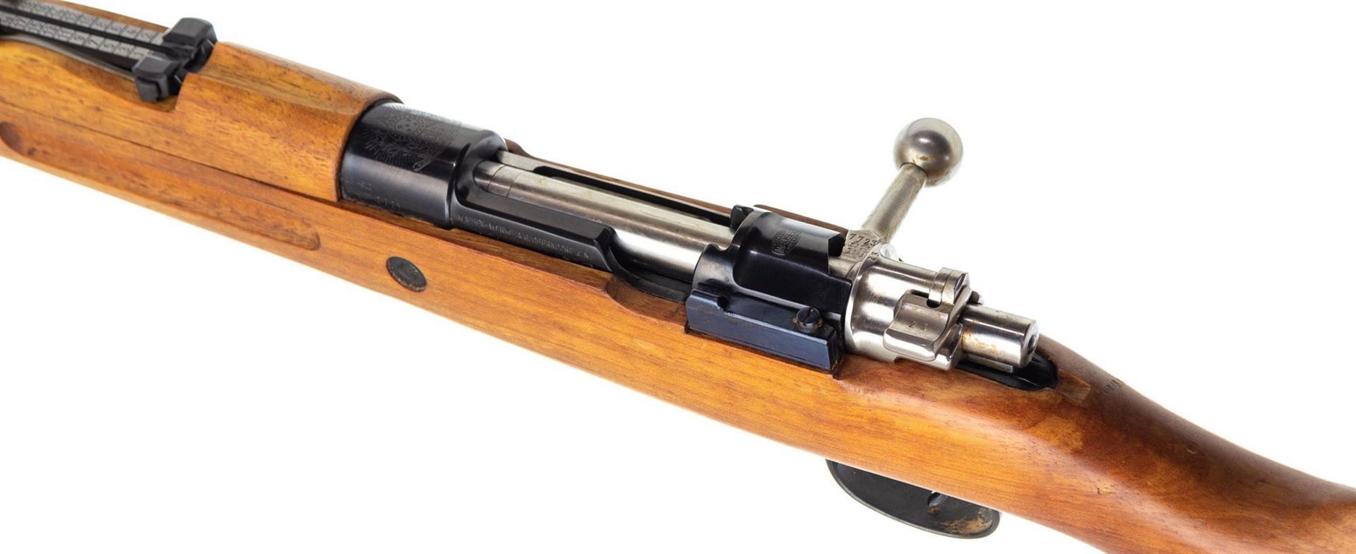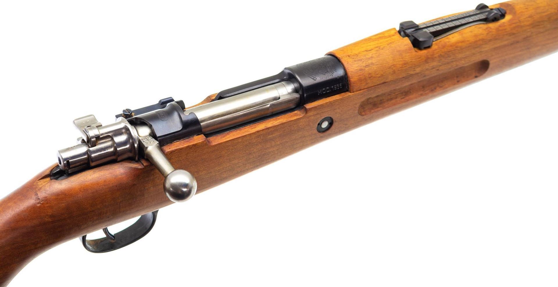 Used Mauser Model 1935 Brazilian Bolt-Action 7x57mm, 30" Barrel, Full Military Wood, Matching Numbers incl. Bayonet, With Muzzle Protector & Factory Test Target, Good Condition