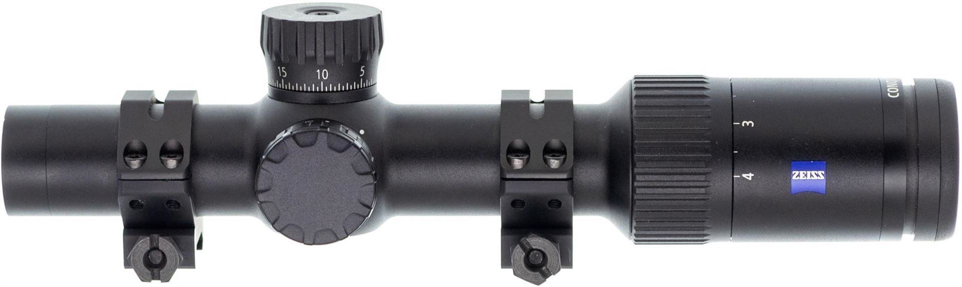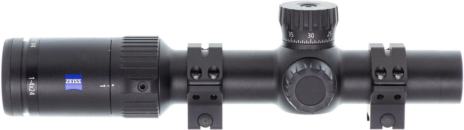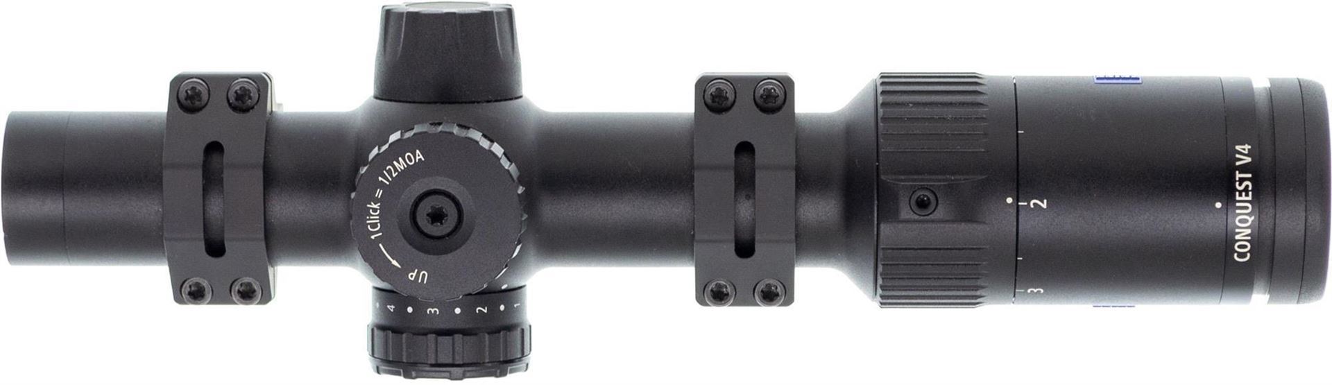 Used Zeiss Conquest V4 Riflescope - 1-4x24mm, 30mm, Illuminated ZQAR Reticle (#62), ASV Elevation Turret, 1/2 MOA Click Adjustment, Matte Black, Weaver Skeleton Rings, Original Box, Very Good Condition